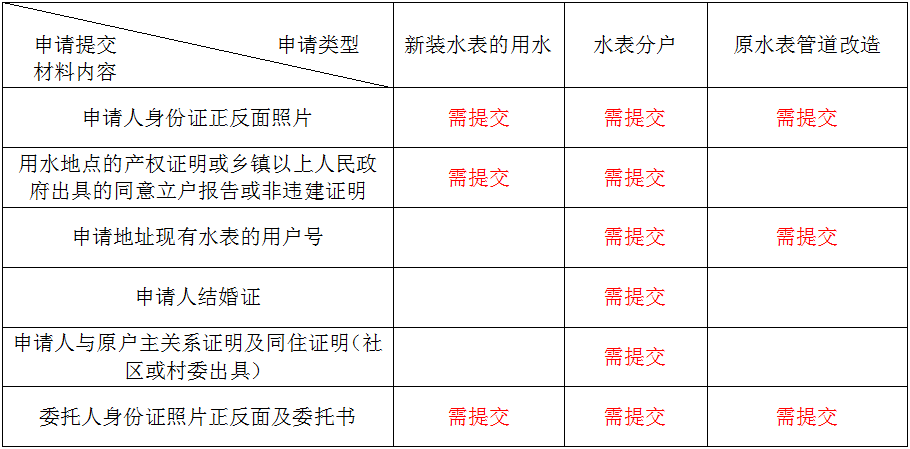 備注:按表格提示要求提交上傳材料,供水單位工作人員現(xiàn)場勘察時,申請人應(yīng)提供與在網(wǎng)上申請?zhí)峤幌嘁恢碌牟牧线M(jìn)行備查。